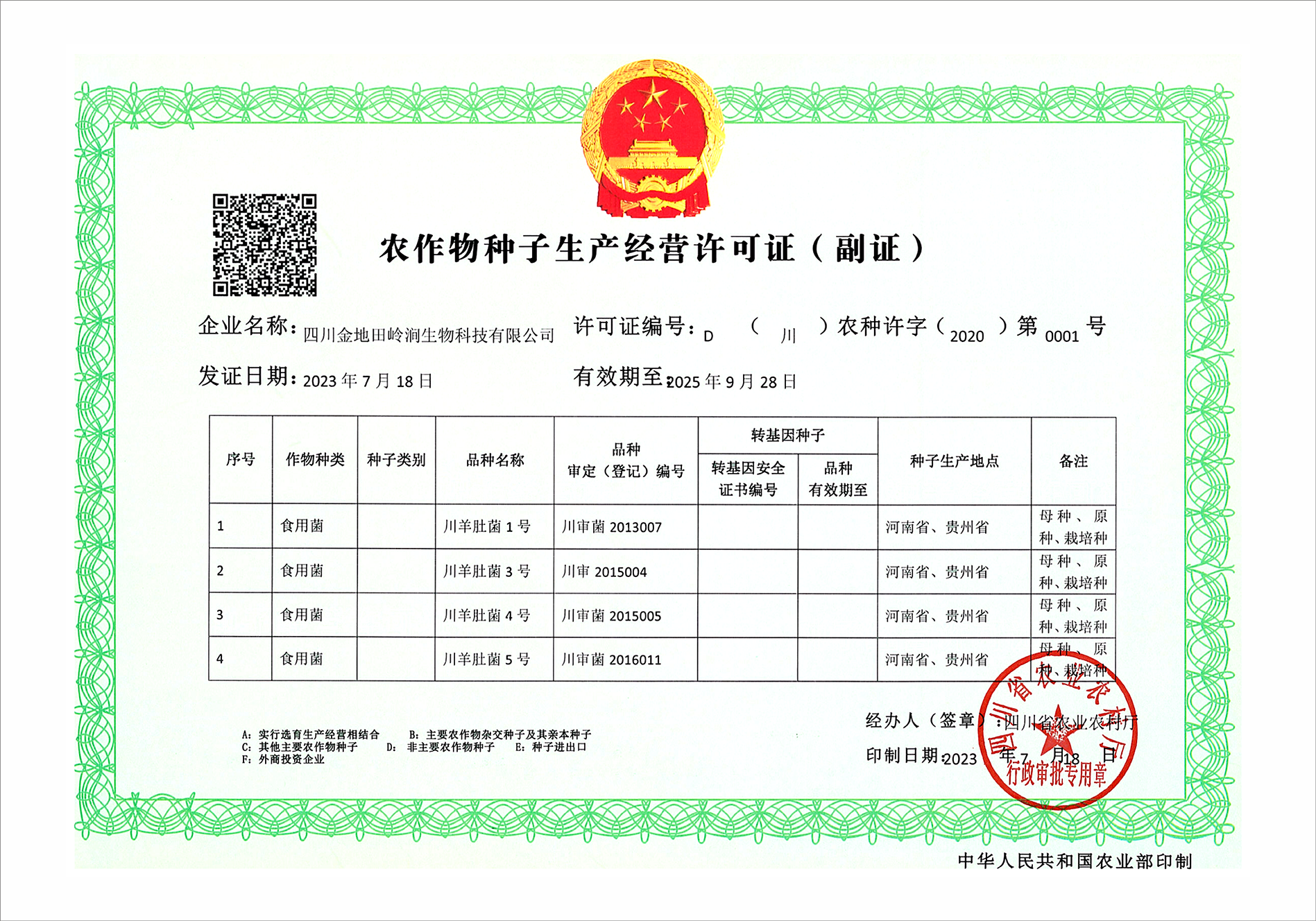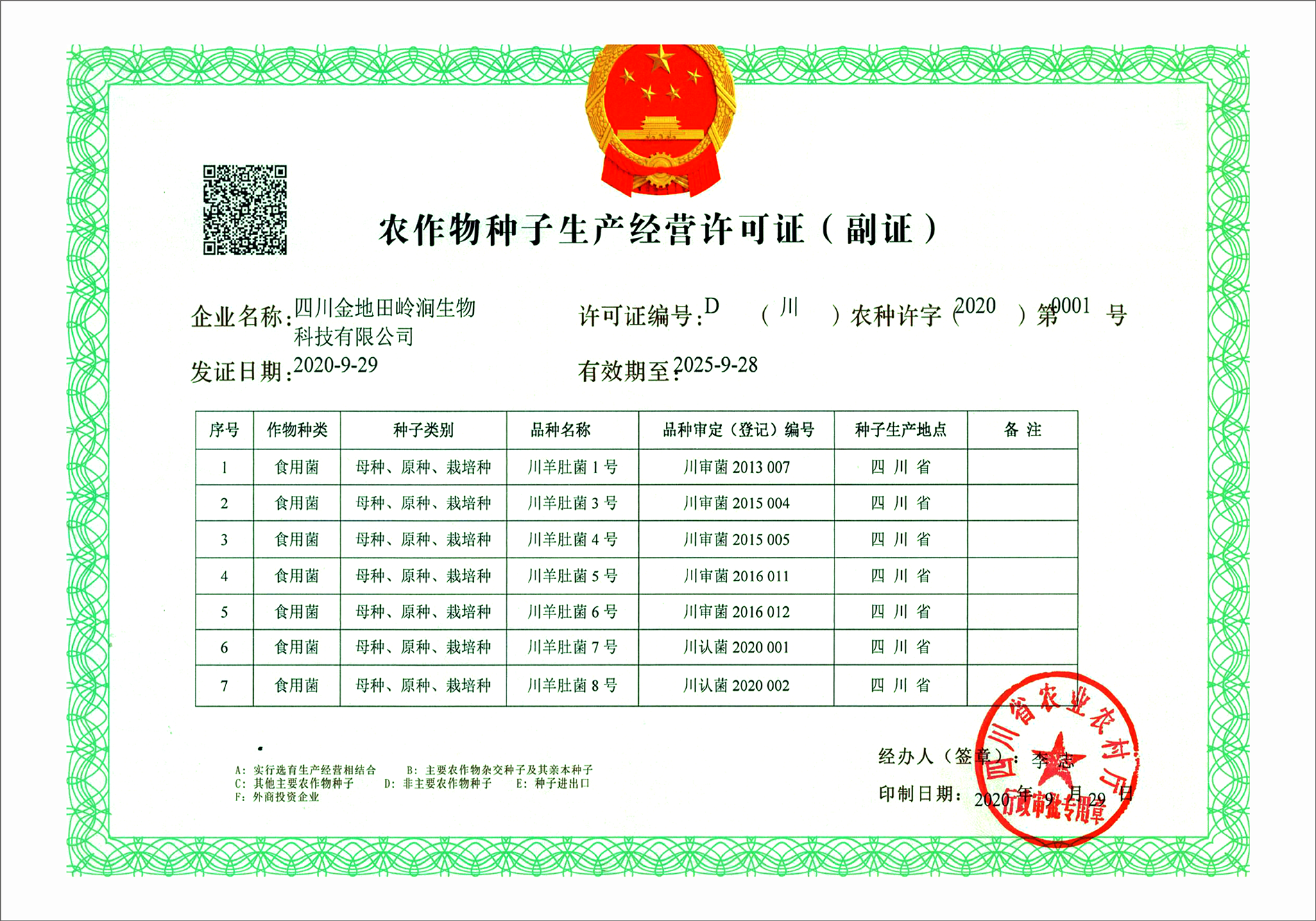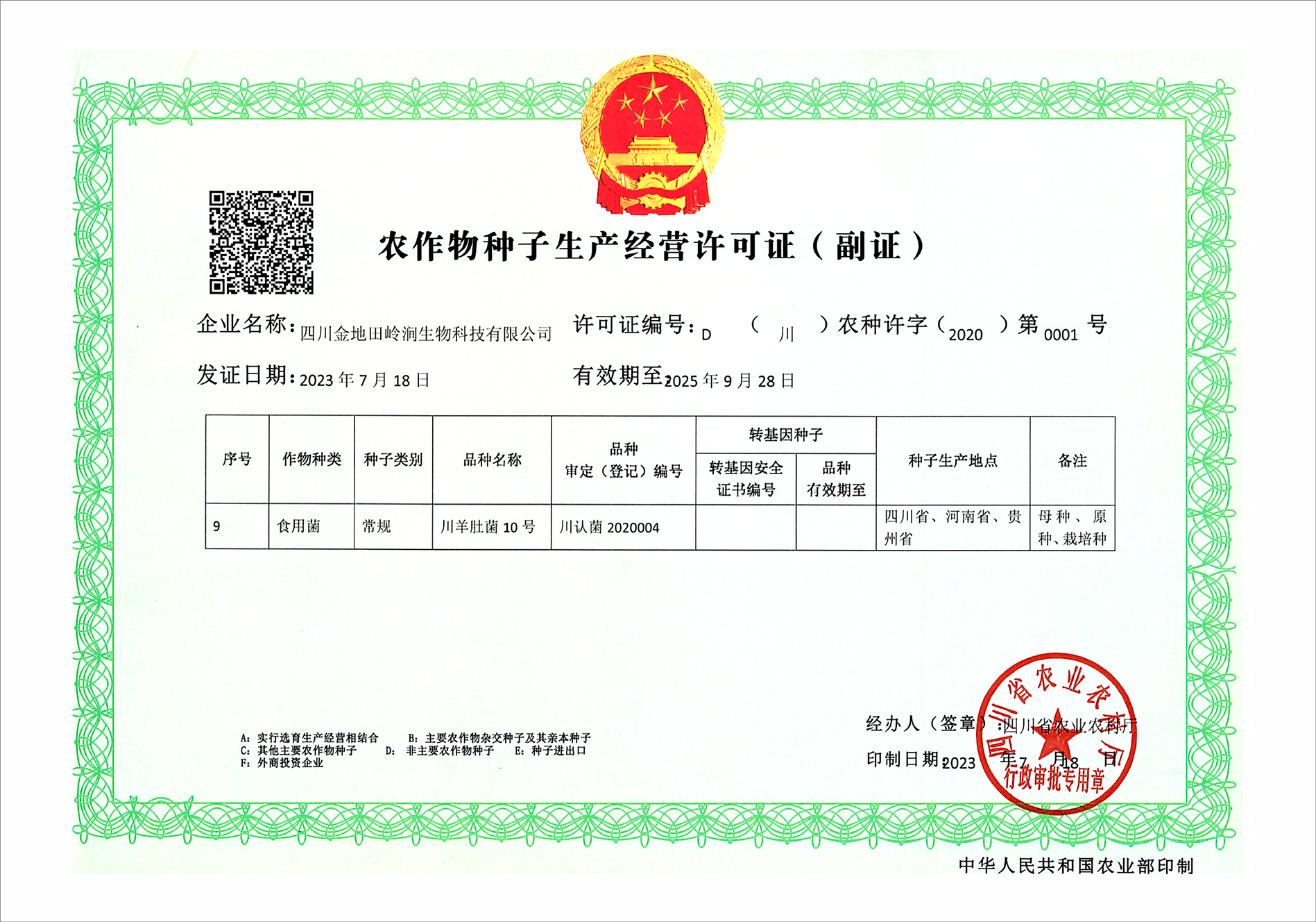 农作物种植生产经营许可证